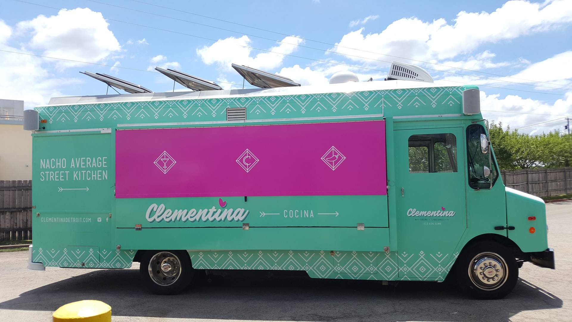 Logo and identity designs for Clementina Cocina + Bar included wraps for both the shipping container and food truck, pattern and icon designs, t-shirts, menus, and other swag.