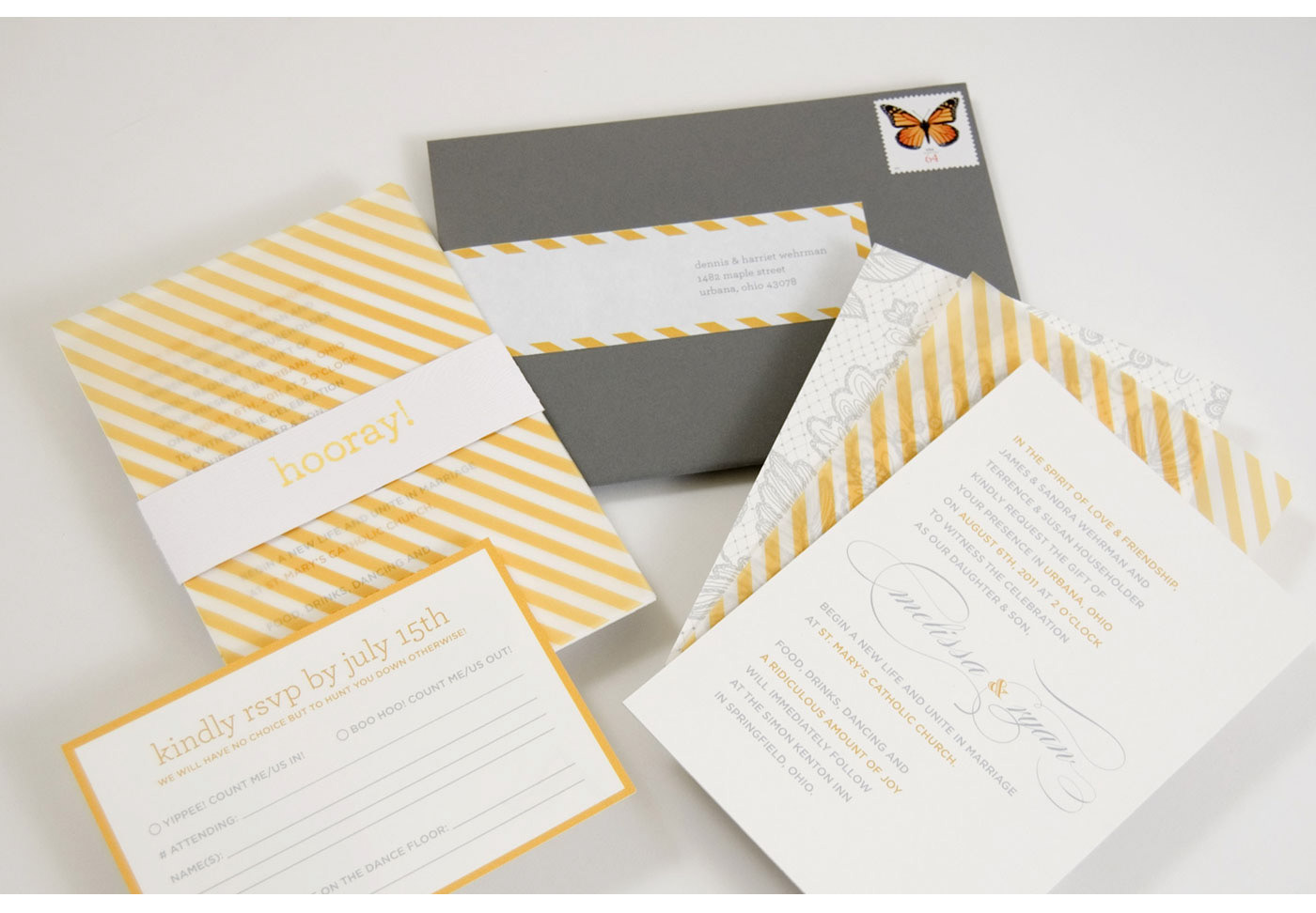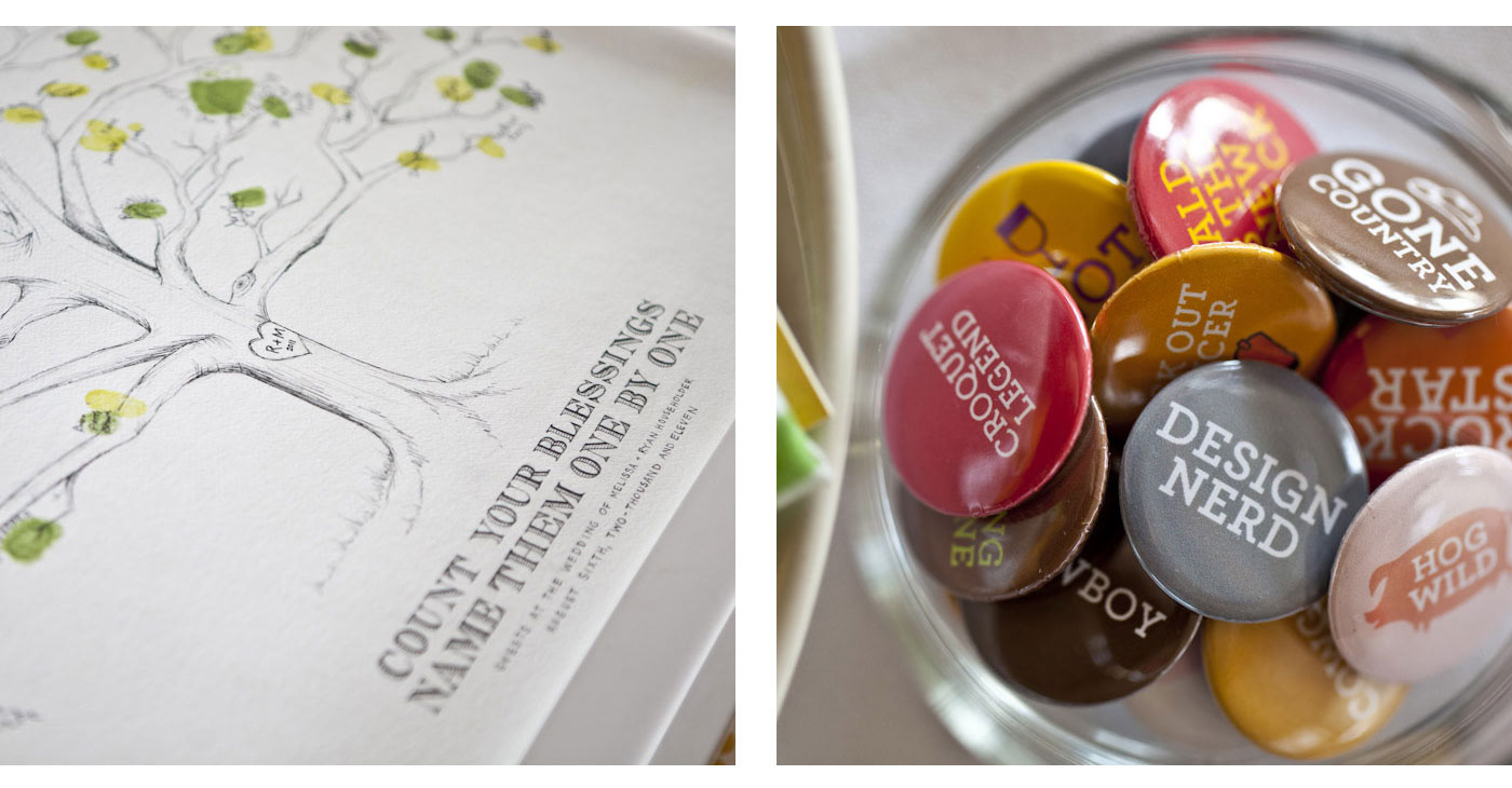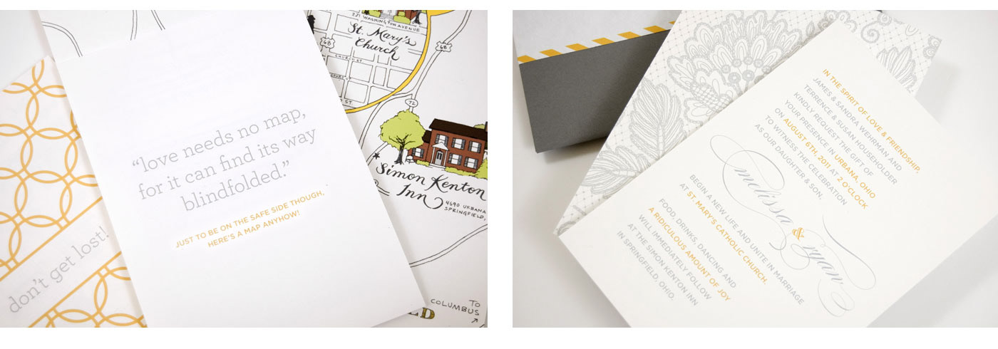 I don't design a lot of wedding stationery because — let's be serious — brides are scary. I did however take on this daunting wedding as a personal favor to the groom since I was the one marrying him. Even ten years later, I still love the balance of playfulness and elegance. The details and humor just speak to our personalities and it completely set the scene for one of the best days ever.