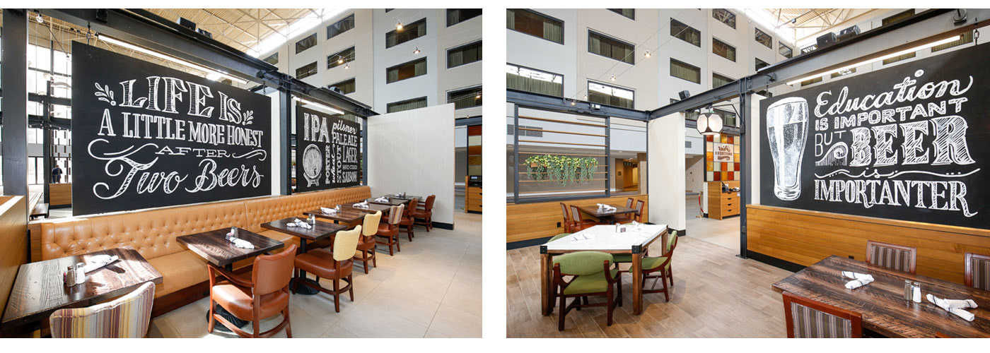Working with the glass vendors, architects and designers, we designed a glass grid frame to enclose the restaurant space in the lobby while still keeping things airy and bright. I also designed sketchy chalk-style typography and illustrations that we hired a local painter to create on-site.