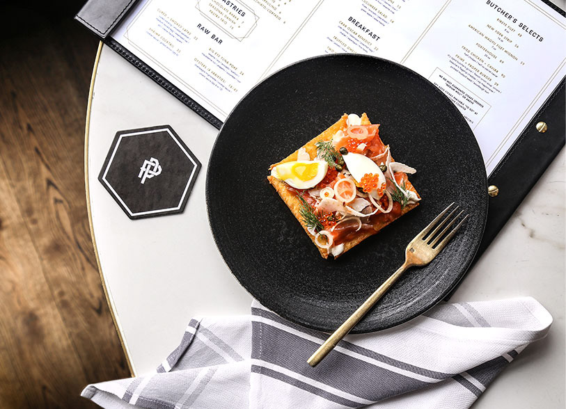 Deliverables also included print and apparel swag, butcher wrap paper and stickers, wax stationery seals, shirts, high-quality fashion caps, pens, and stationery with the most elegant gold foil stamping and luxurious paper stocks. Rounding out brand are other thoughtful design details — coasters, uniforms, signage/tiles, and, of course, the menus.